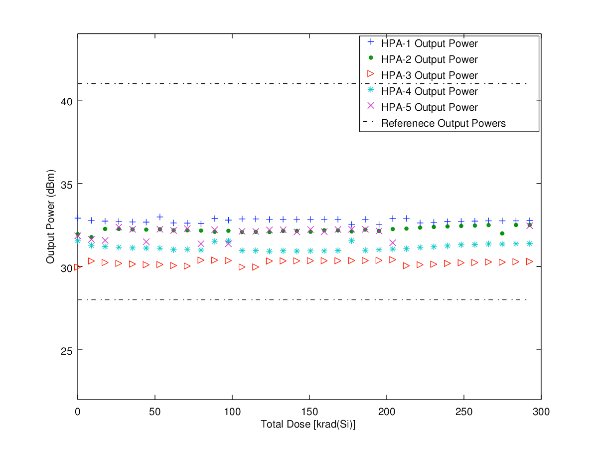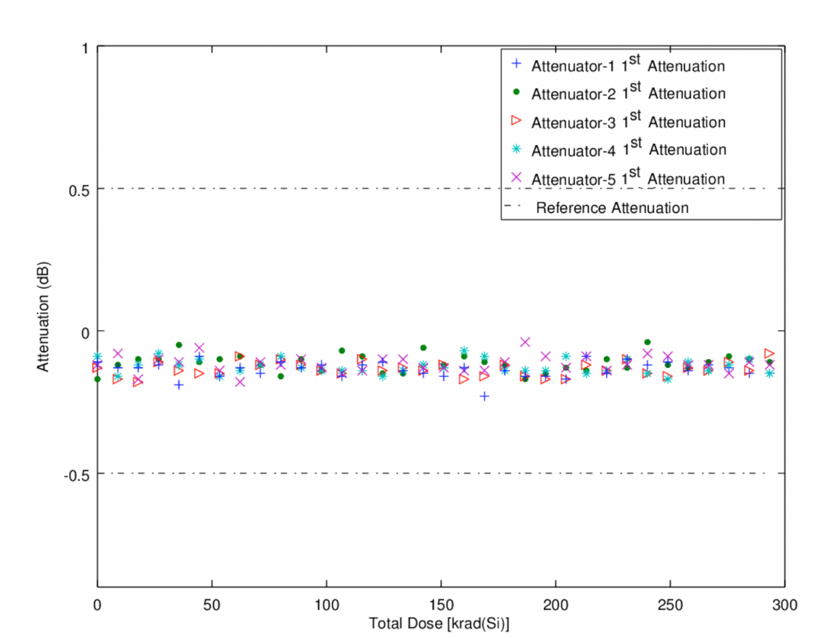 Radyasyon testleri 300krad değerine ulaşana kadar yapılmış olup güç yükselteç modülleri ve analog zayıflatıcıların analiz sonuçları Şekil 4 ve Şekil 5’de verilmektedir. Güç yükselteç modüllerinin çıkış gerilimi 300krad radyasyon seviyesine kadar bir değişim göstermemiştir. Analog zayıflatıcı için ise ilk zayıflama değerinin gözlemlenmesi önemlidir. İlk zayıflama değeri radyasyon değeri arttıkça salınmaktadır. Hem güç yükselteç modülleri için hem de analog zayıflatıcı için radyasyon ile karakteristik gerilim ve zayıflama %1’den daha az değişmektedir.