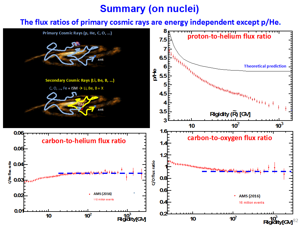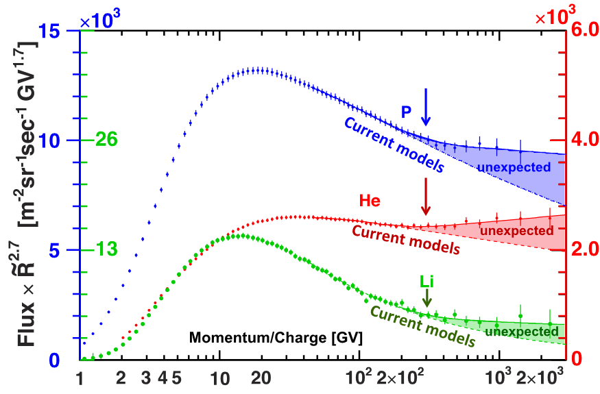 Proton, helyum, karbon ve oksijen çekirdekleri birincil kozmik ışın oldukları ve aynı kaynaktan üretildikleri için akı oranları bükülmezlikten (rigiditeden) bağımsız olmalıdır. Şekil 9'da görüldüğü üzere, AMS ölçümlerindeki karbon-helyum ve karbon-oksijen akılarının oranları tam da beklenildiği gibi bükülmezlikten bağımsızdır, yani düzdür. Beklenmedik bir şekilde, proton-helyum akı oranı bükülmezlik ile hızlı ve düzgün bir şekilde düşmektedir (Şekil 10).