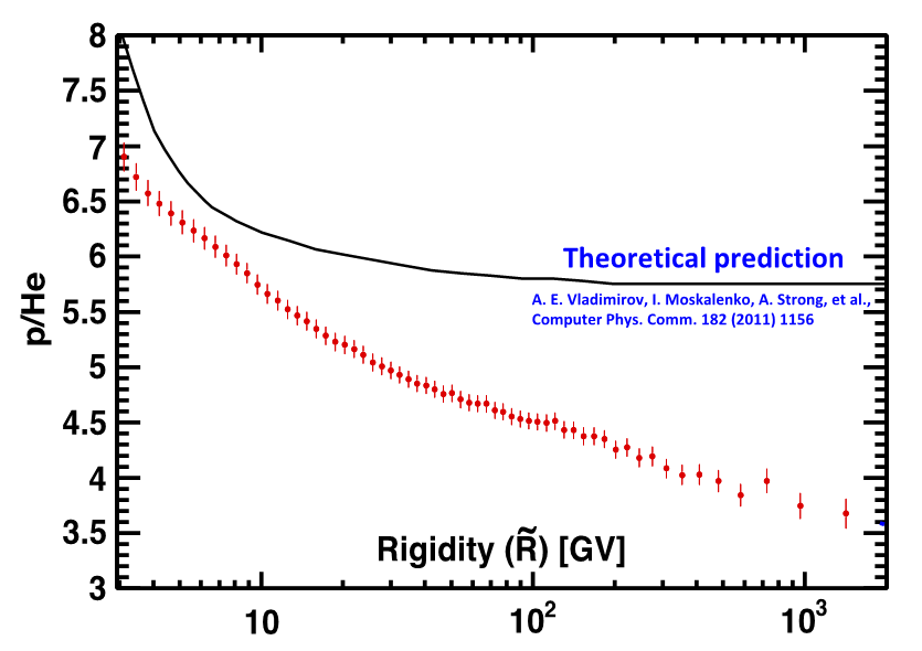 Şekil 11. Proton-Helyum akılarının oranı. Protonlar ve helyum çekirdekleri de birincil kozmik ışınlardır ve bu yüzden proton-helyum akılarının oranı, teorik tahminlere göre siyah çizgide gösterildiği gibi bükülmezlikten bağımsız olmalıdır. Kırmızı noktalarla gösterilen AMS ölçümleri, teorik tahminlerle ve Şekil 9'da gösterilen diğer kozmik ışın akı oranlarıyla çelişmektedir.
