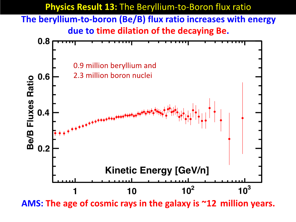 AMS tarafından ölçülen diğer ikincil kozmik ışınlar arasında bor ve berilyum da bulunmaktadır. Berilyumun kararsız izotopunun (10Be) yarı ömrü 1.5 milyon yıldır ve bu element bora bozunur. Bu kararsızlıktan dolayı, Be ışık hızına yaklaştığında izafi zaman genişlemesinden dolayı Be/B oranı artar. Bu nedenle berilyumun bora oranı galaksideki kozmik ışınların yaşıyla ilgili bilgi sağlar. Bunu kullanarak, AMS galaksimizdeki kozmik ışınların yaşını yaklaşık 12 milyon yıl olarak bulmuştur (Şekil 11).