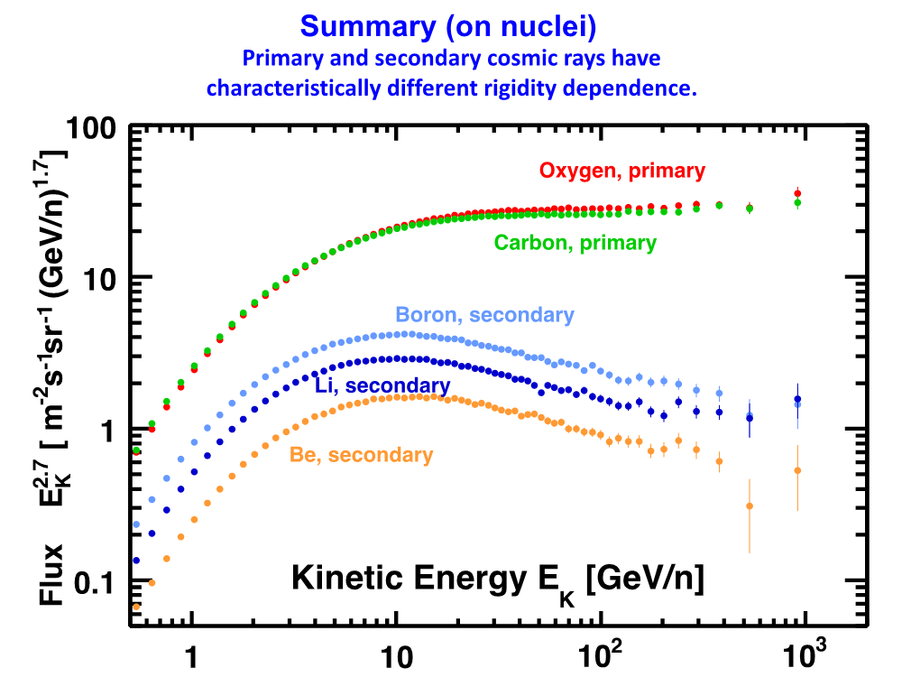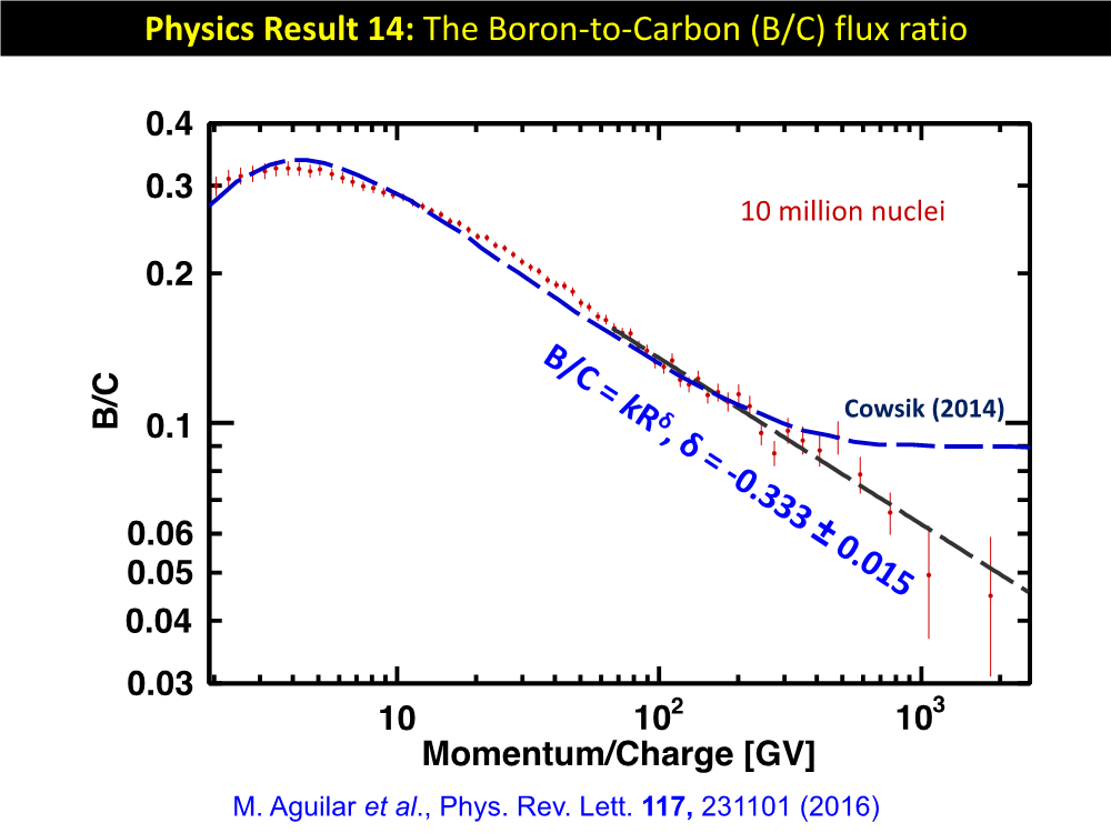 İkincil kozmik ışınlar(bor) ile birincil kozmik ışınlar(karbon) arasındaki akı oranı kozmik ışınların galaksi içerisinde yol aldığı malzemenin (ISM) ortalama yoğunluğu ve kozmik ışın yayılımı ile ilgili bilgi sağlar. Kozmik ışın yayılımı genellikle manyetik plazmada dağılan ve hızlı hareket eden bir gaz gibi modellenir. Çeşitli manyetik plazma modelleri bor-karbon (B/C) akılarının oranının bükülmezlik bağımlılığını farklı tahmin eder. Şekil 12’ de gösterildiği gibi AMS tarafından ölçülen 65 GeV üstü B/C oranı, tek bir üssel fonksiyonla (B/C= kR, = -0.333±0.015) açıklanabilir. Bu ölçümler manyetik plazmanın Kolmogorov türbülans modeli ile, asimptotik olarak -1/3 olunca uyumludur. Aynı önemde başka bir konu da pek çok kozmik ışın modelinin aksine, B/C akılarının oranının herhangi belirli bir yapı göstermemesidir.