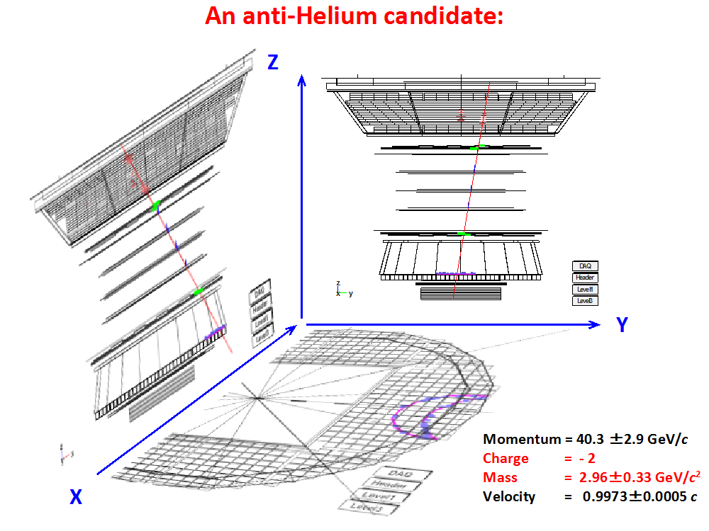5 yıl içerisinde AMS 3.7 milyar helyum (yük Z = +2) olayı toplamıştır. Bugüne kadar AMS 3He kütlesinde birkaç Z = -2 olayı gözlemlemiştir. Şekil 14’ de buna örnek teşkil eden bir olay gösterilmiştir.
