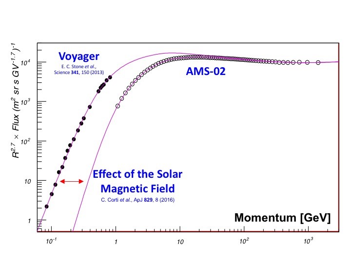 Kozmik ışınlar içerisinde, protonlar evrende en çok bulunanlardır. AMS 300 milyon proton verisi ile proton akısını %1 doğrulukla ölçmüş ve proton akısının enerji bağımlılığının, onlarca yıldır varsayıldığı gibi, tek bir üssel fonksiyonla gösterilemeyeceğini ve proton spektrum indeksinin momentumla değiştiği keşfetmiştir. ISS'te bulunan AMS tarafından ölçülmüş yüksek enerjili proton spektrumunu, güneş sistemimiz dışındaki Voyager uzay aracının ölçtüğü düşük enerjili proton spektrumu ile karşılaştırarak Şekil 7'de gösteriyoruz. Bu karşılaştırma güneşin manyetik alanı ile ilgili bilgi vermektedir.